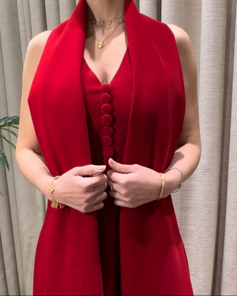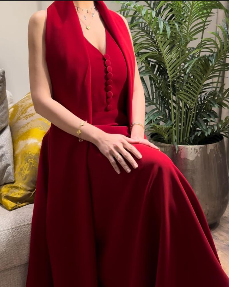 فستان احمر ناعم ب شال وقماش الكريب الاسترتش