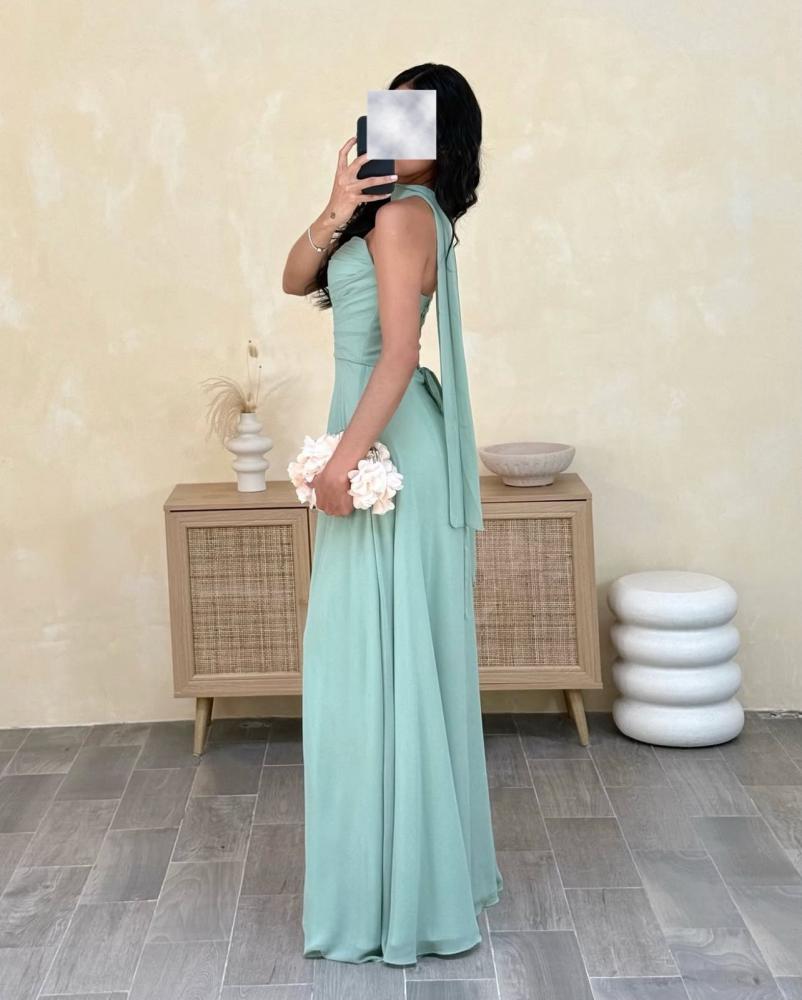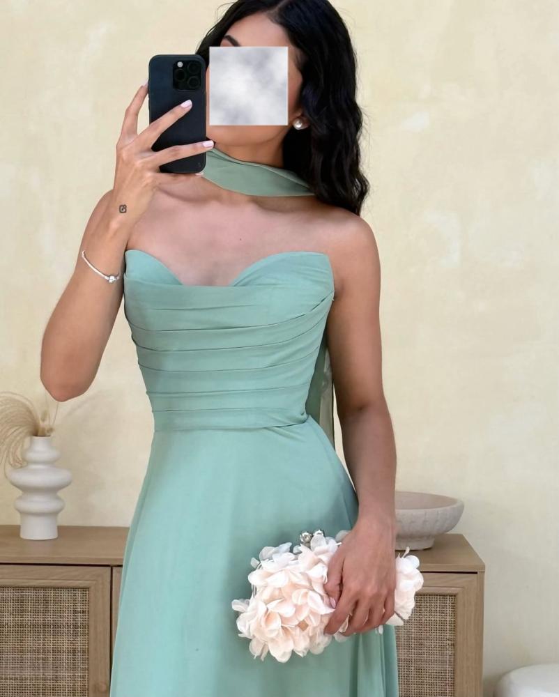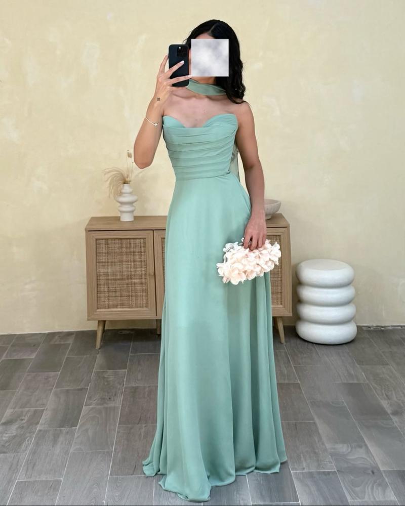 فستان تب طويل ناعم بشال منفصل بقماش الشيفون الناعم مبطن لون تيفاني
