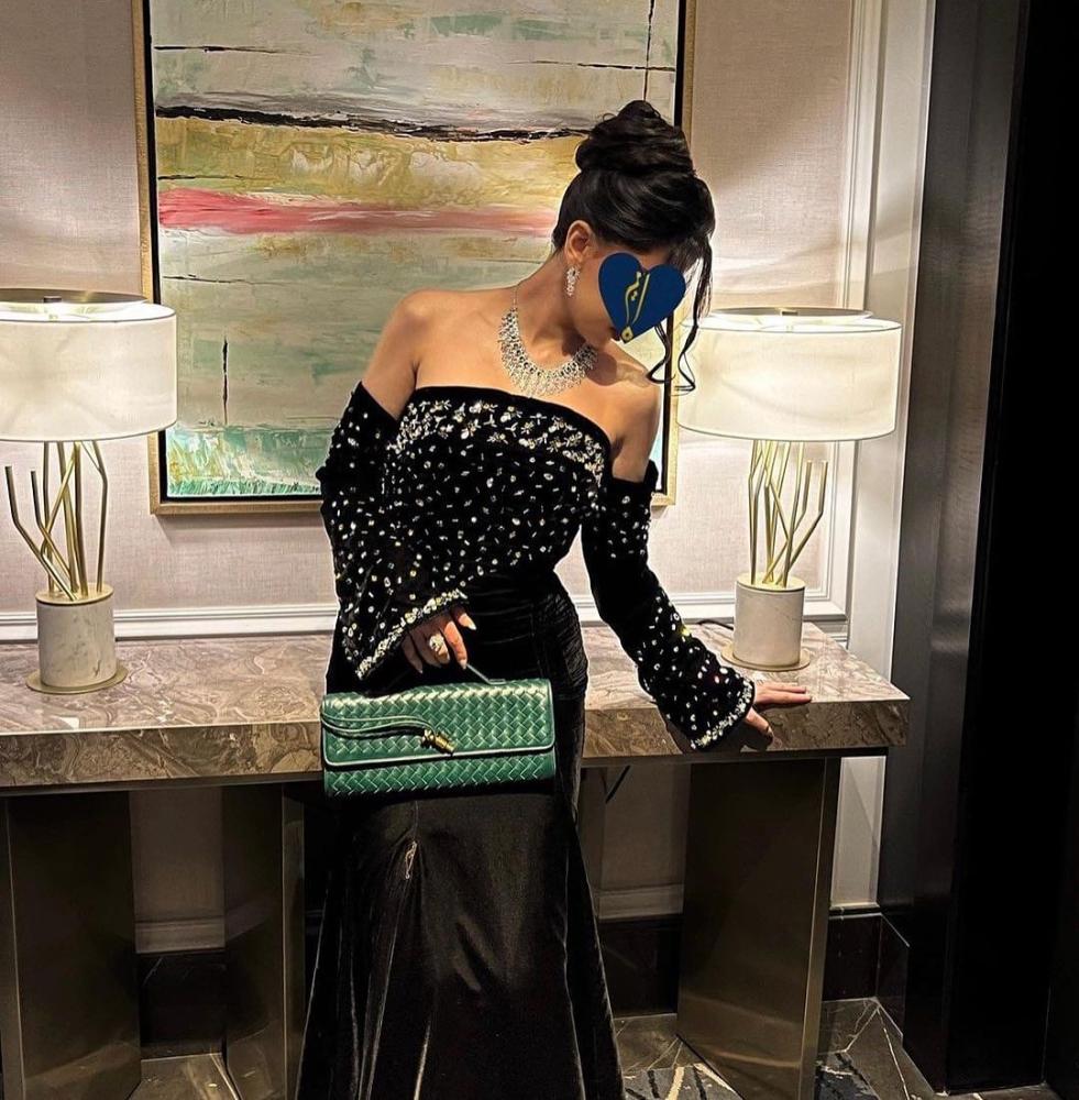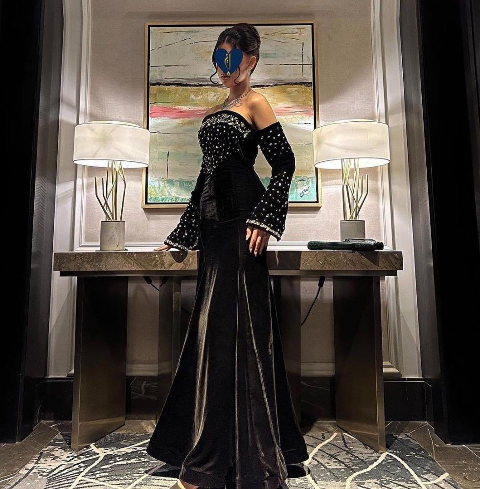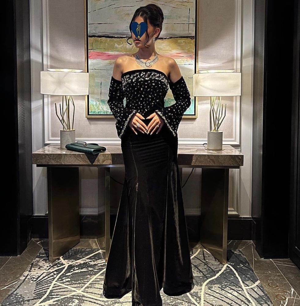 فستان مخمل طويل مطرز خرز يدوي صدر واطراف الاكمام باللون الاسود