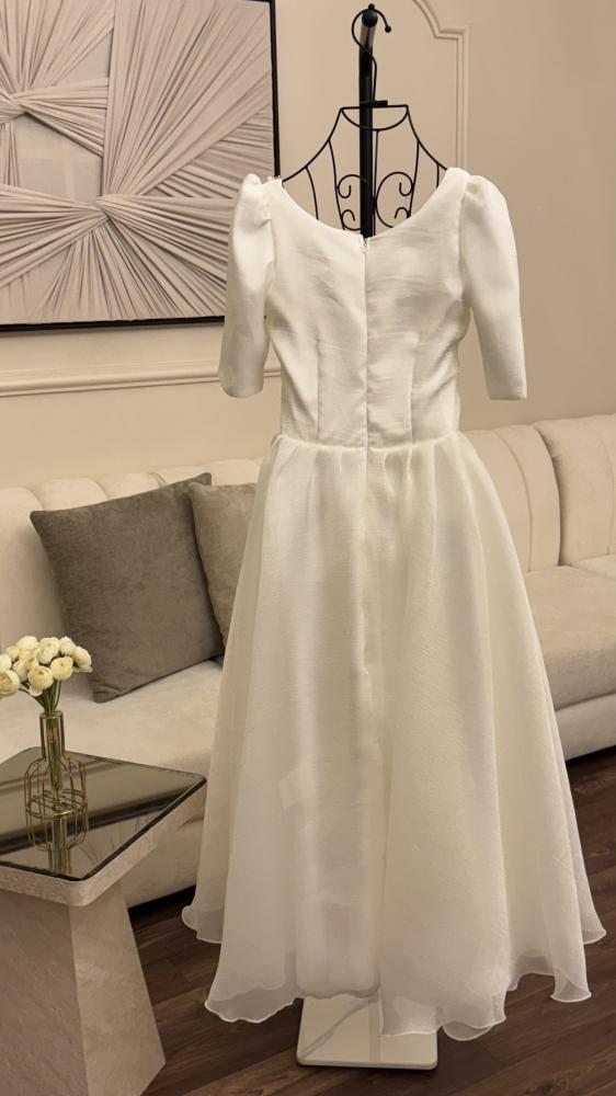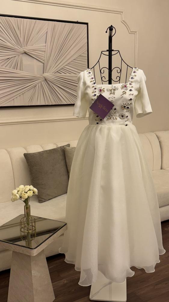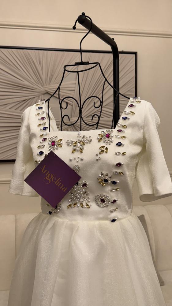 فستان ميدي لون ابيض مطرز كرستال يدوي ملون نص كم بقماش الجازار المنفخ