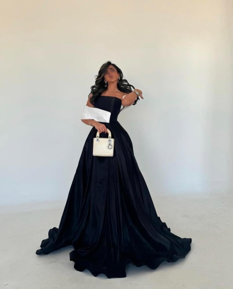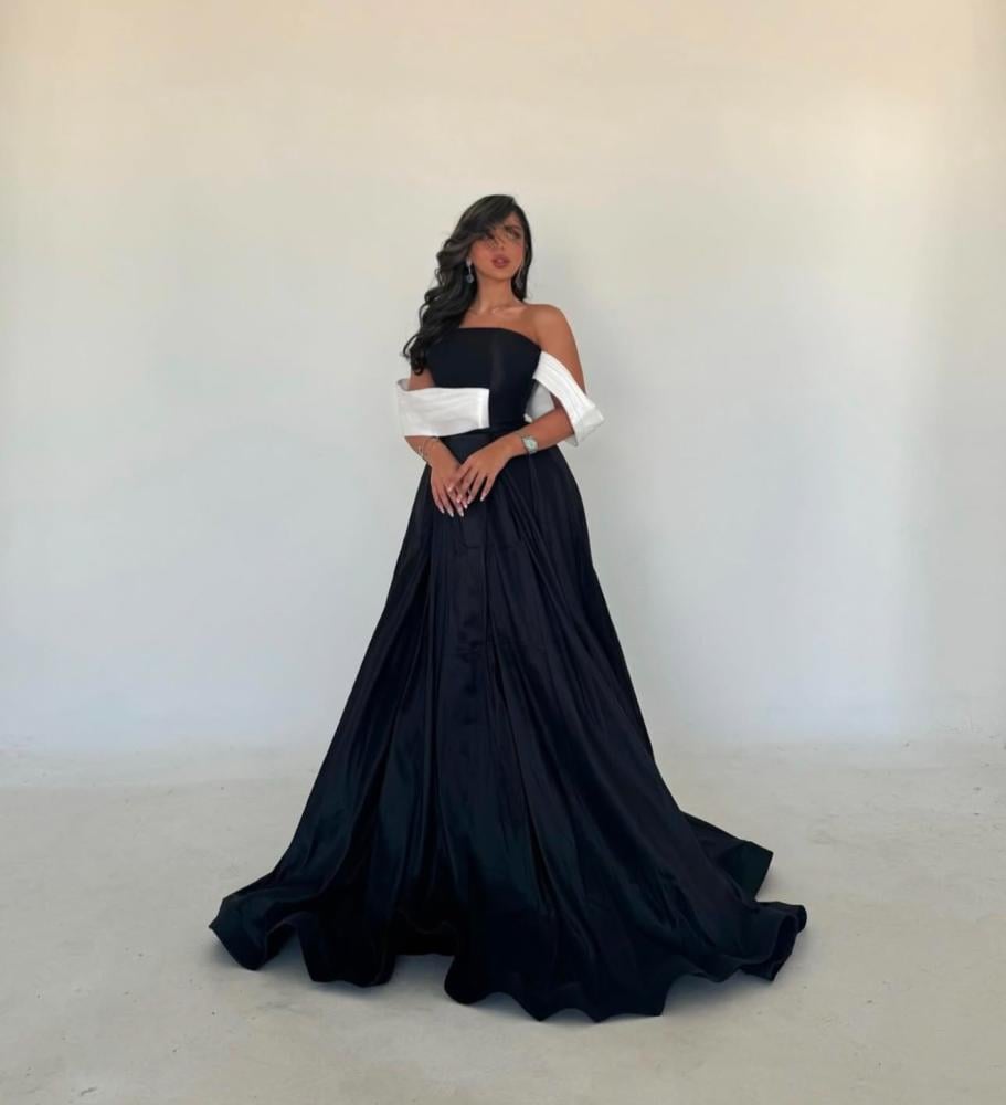 فستان طويل سهرة ناعم لون اسود وابيض بقماش التفتة