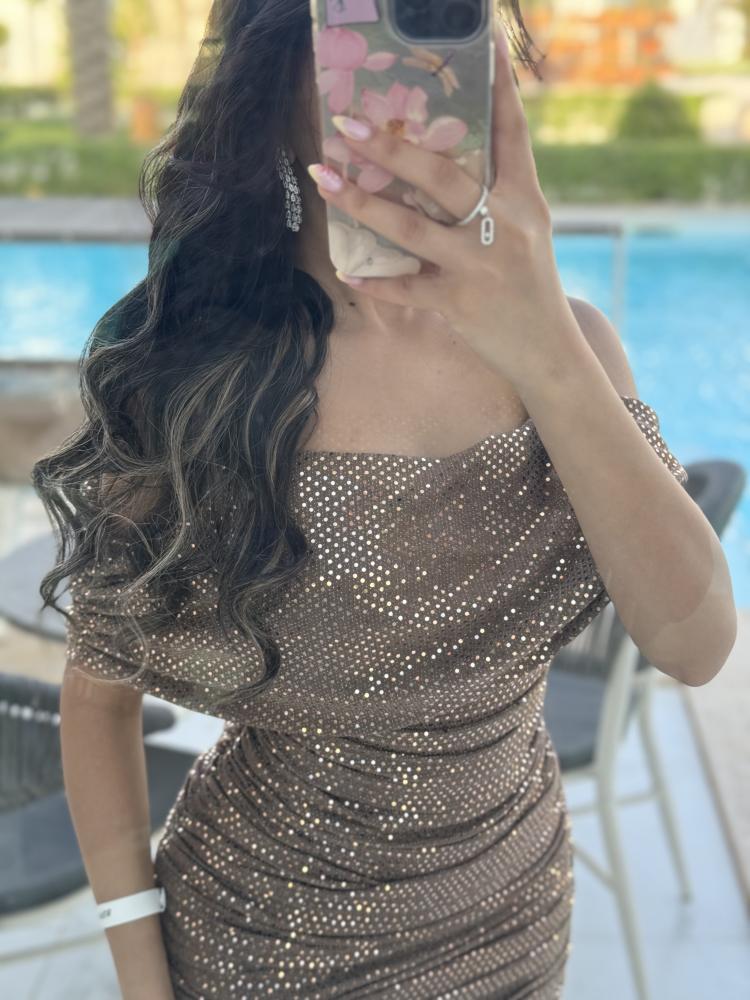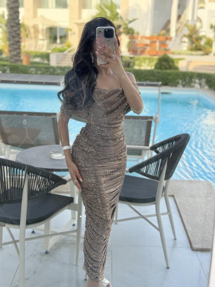 فستان ميدي ناعم لون جلكسي لماع بقماش استرتش ماسك
