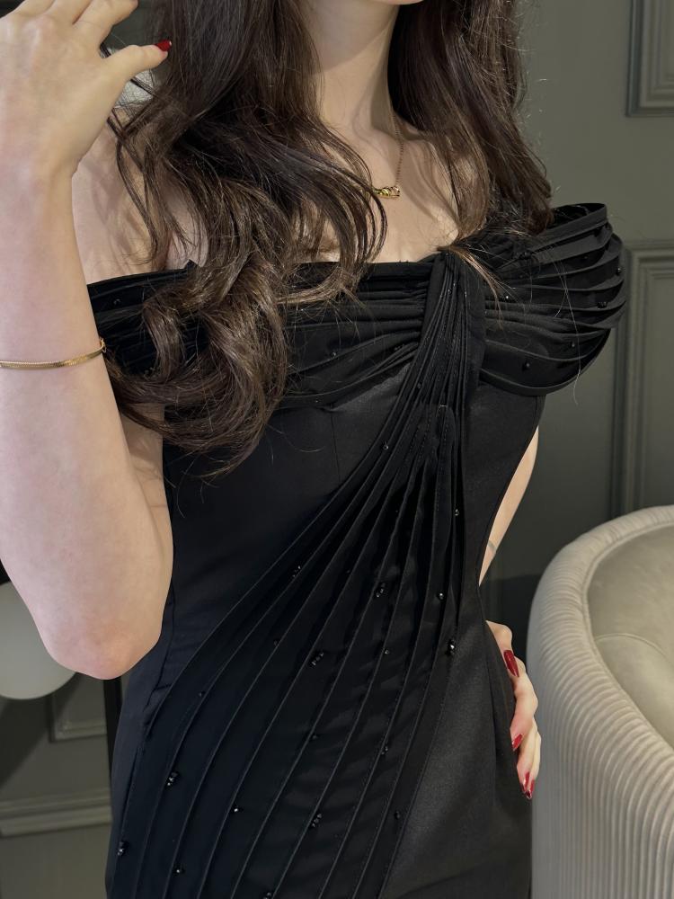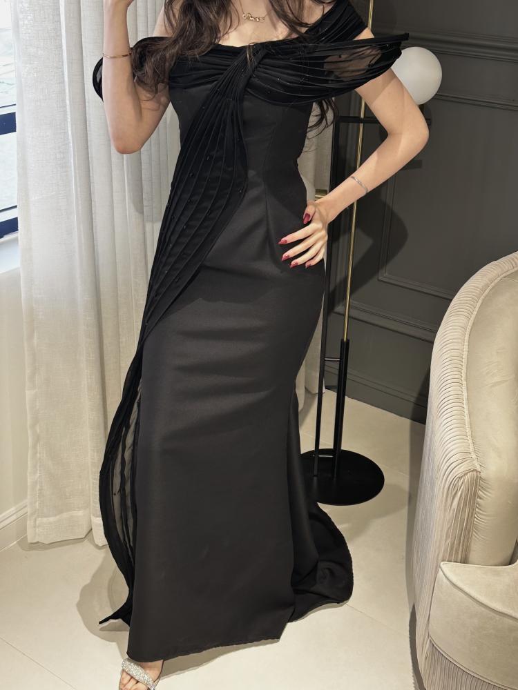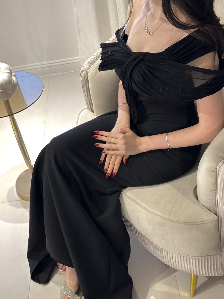 فستان بلون الاسود بخام الباربي مزين بشيفون على مقوي بشكل جميل بفصوصص بخمسة مقاسات من S الى XXL