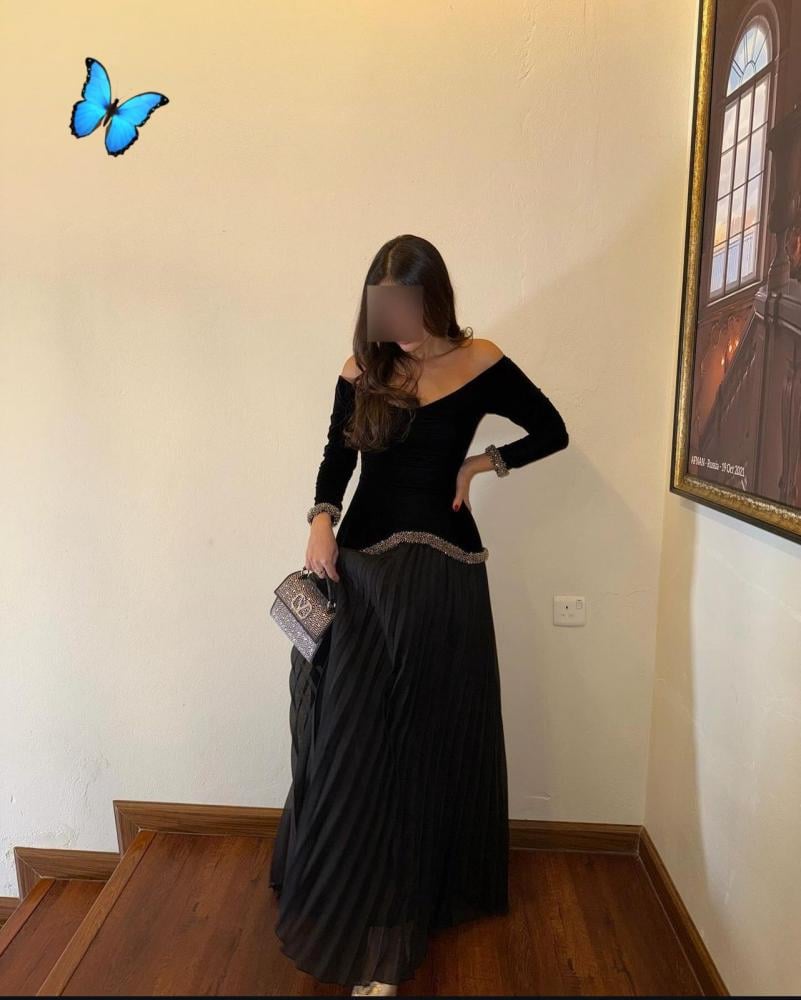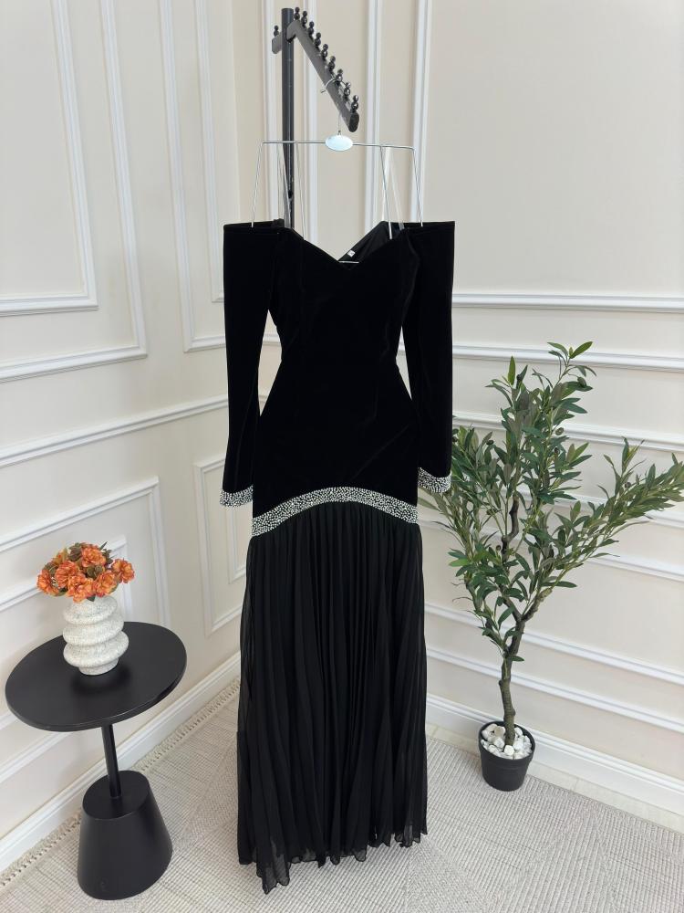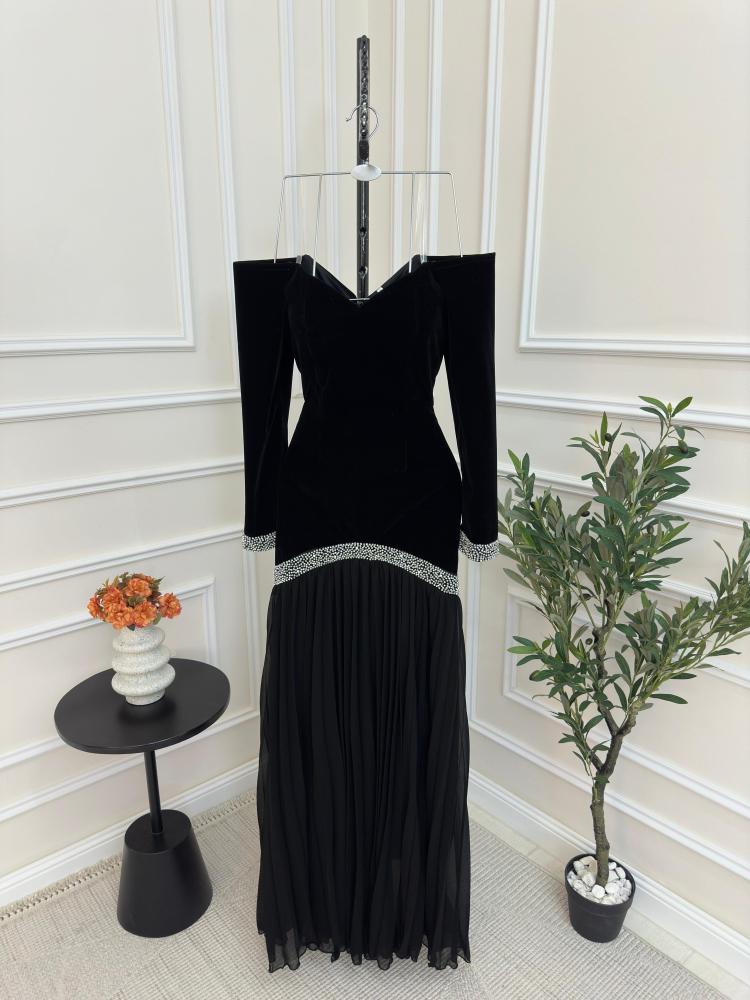 فستان طويل مخمل قطيفه جوخ اسود راقي ب اكمام طويلة وشيفون مكسر بوليسا بإضافة تطريز خرز كرستال يدوي